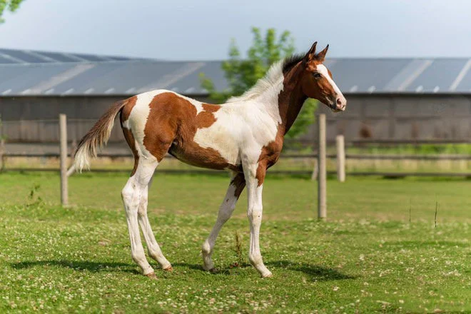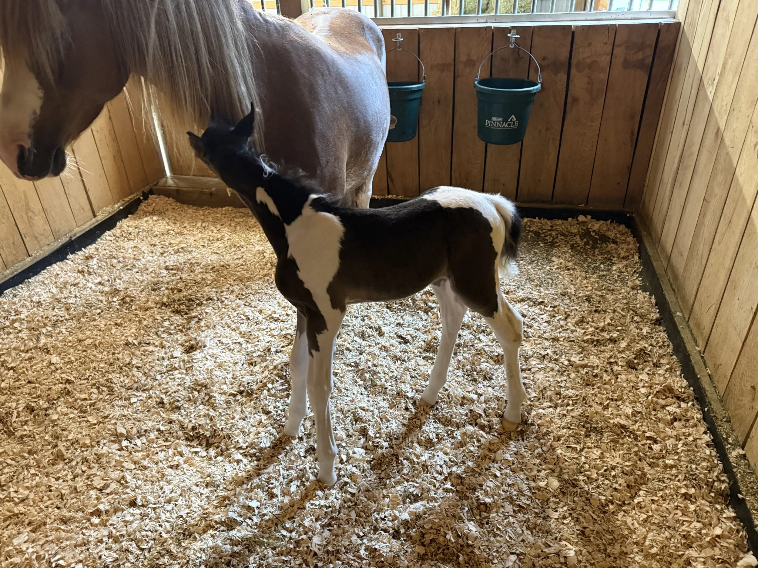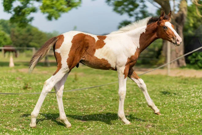 Grimoire D'Elphen has over 100 foals already in Europe. His homozygous gene for tobiano and black and outrageous jumping ability is shining through his foals.